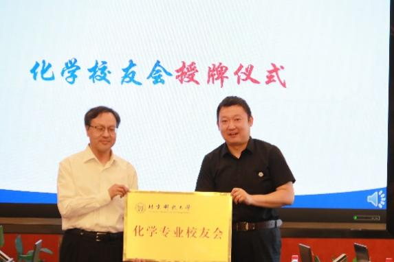 王鲁宁代表学校向化学专业校友会授牌、授旗,为第二届理事会名誉会长、会长、副会长颁发聘书。何进代表学校向第二届理事会秘书长、副秘书长颁发聘书。