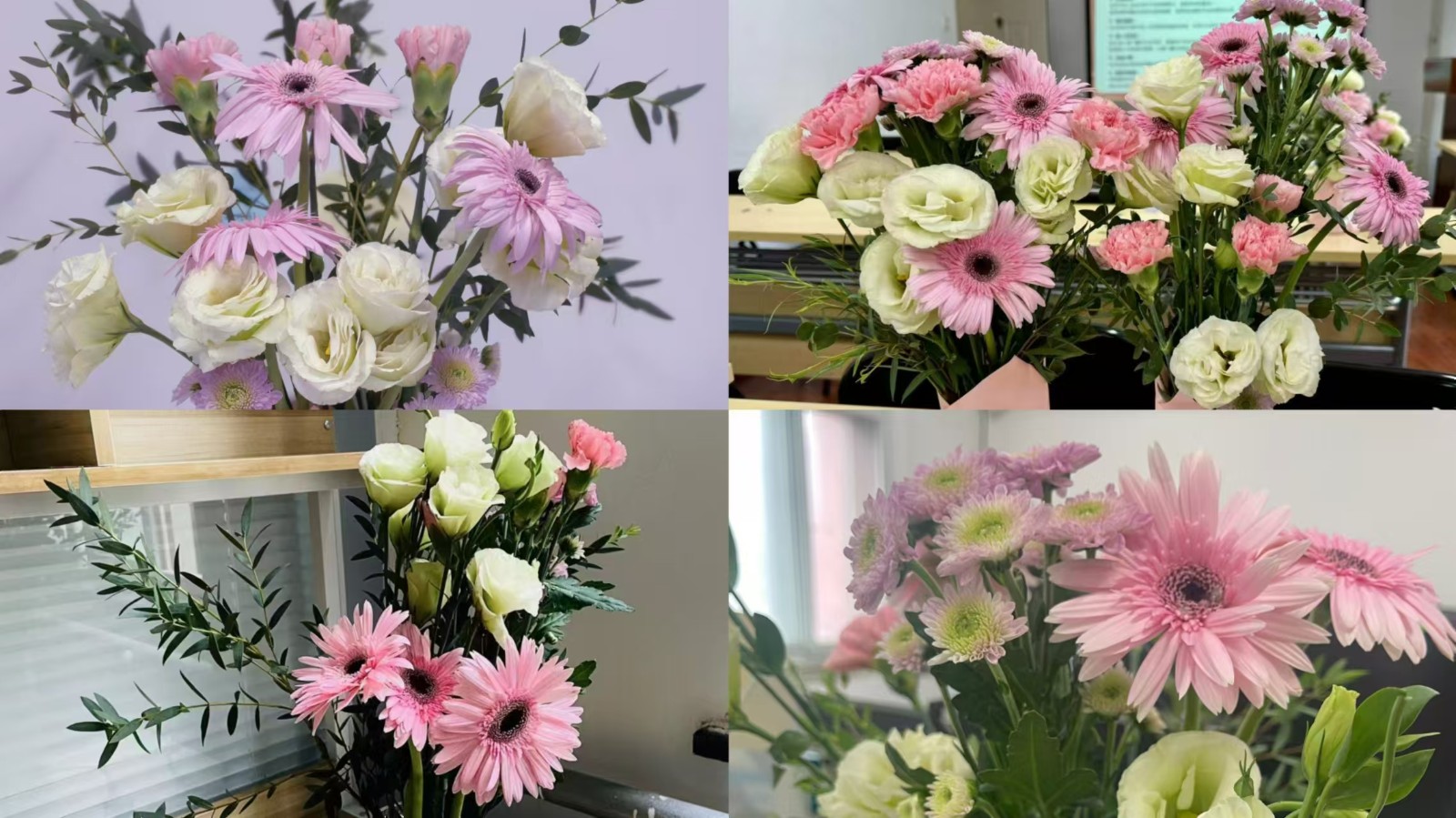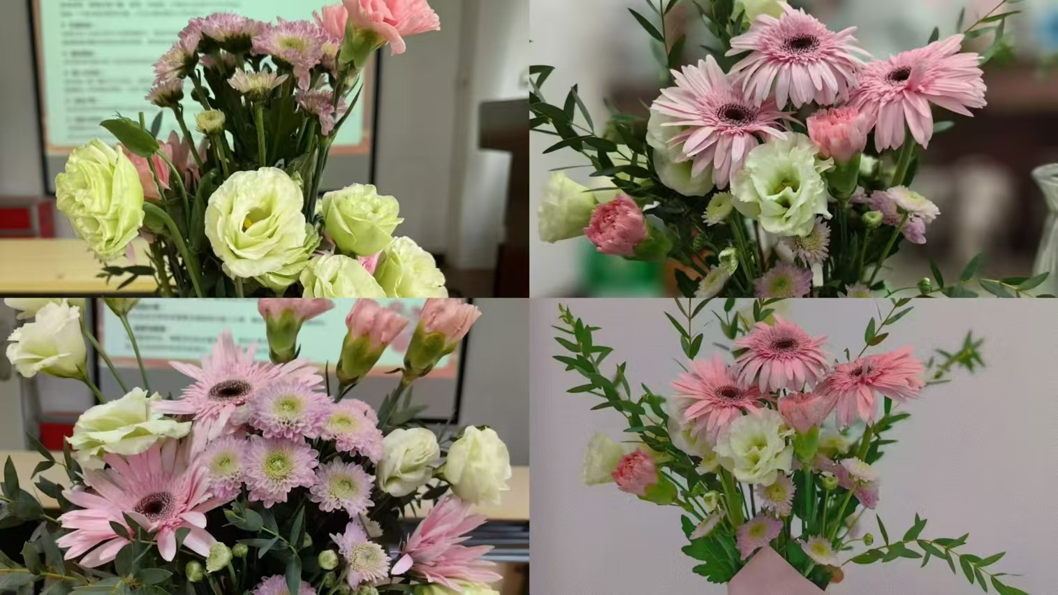 在老师们的精心设计下,让原本普通的鲜花经过修剪、搭配、点缀等步骤变成了色彩斑斓,独具匠心的花艺作品。它们或格调高雅,或清新怡人,或简约有致,尽显老师们对美好的热爱。